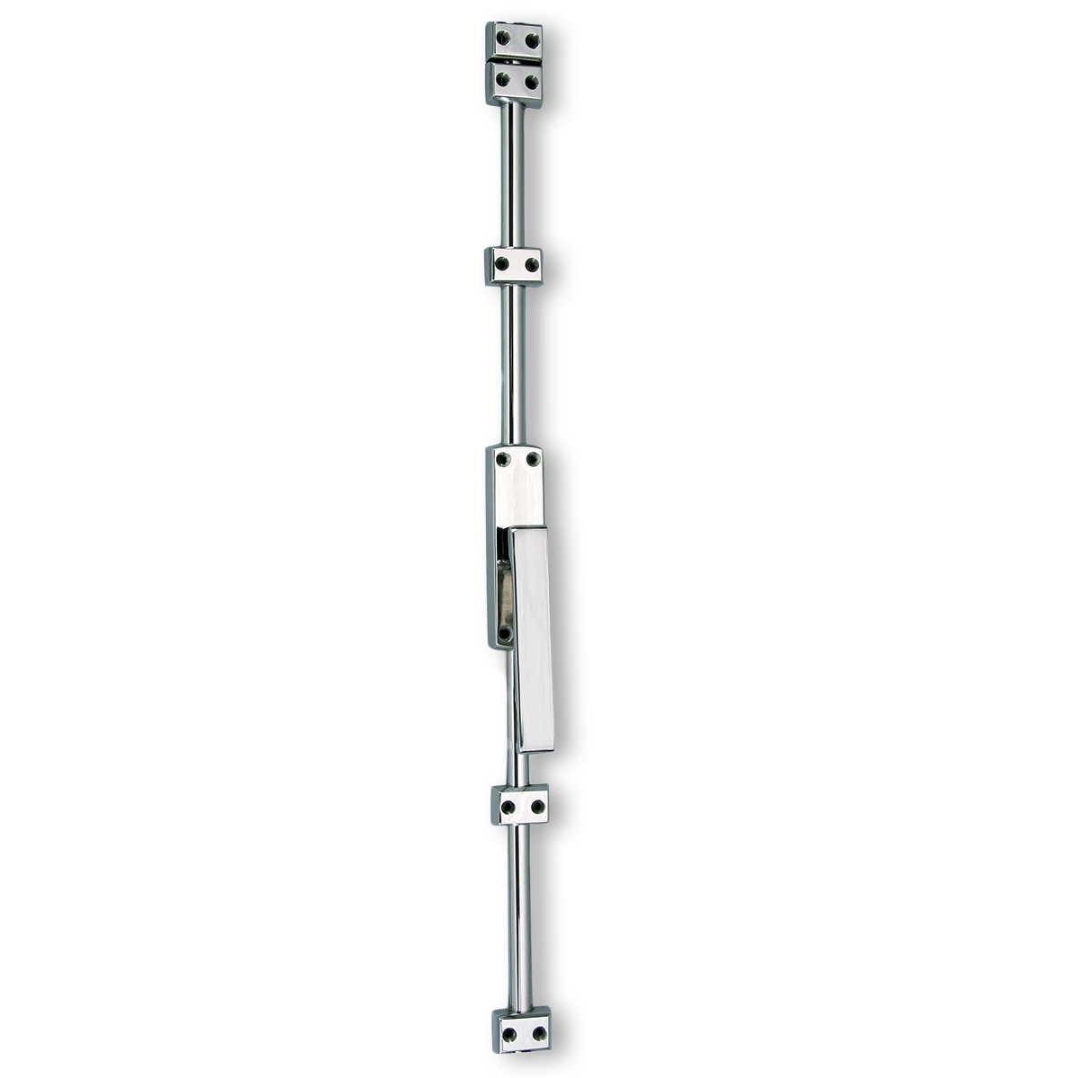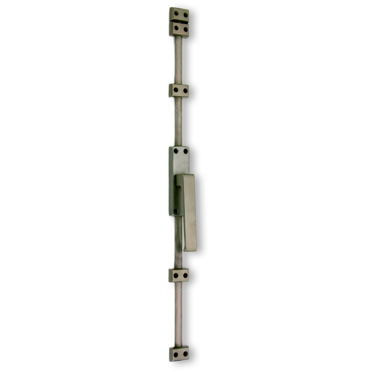 Solid Brass Cremone Bolt- Straight lever. The set includes: case (4 1/4 “* 1 1/5”) , knob or lever (RH o LH), 7 feet rod, 3 strikes, 5 guides and screws. Available in US3- Polished Brass, US3A-Polished Brass Unlaquered, US4- Satin Brass, US10B- Oil Rubbed Bronze, US14- Polished Nickel, US15- Satin Nickel, US26- Polished Chrome, US26D- Satin Chrome